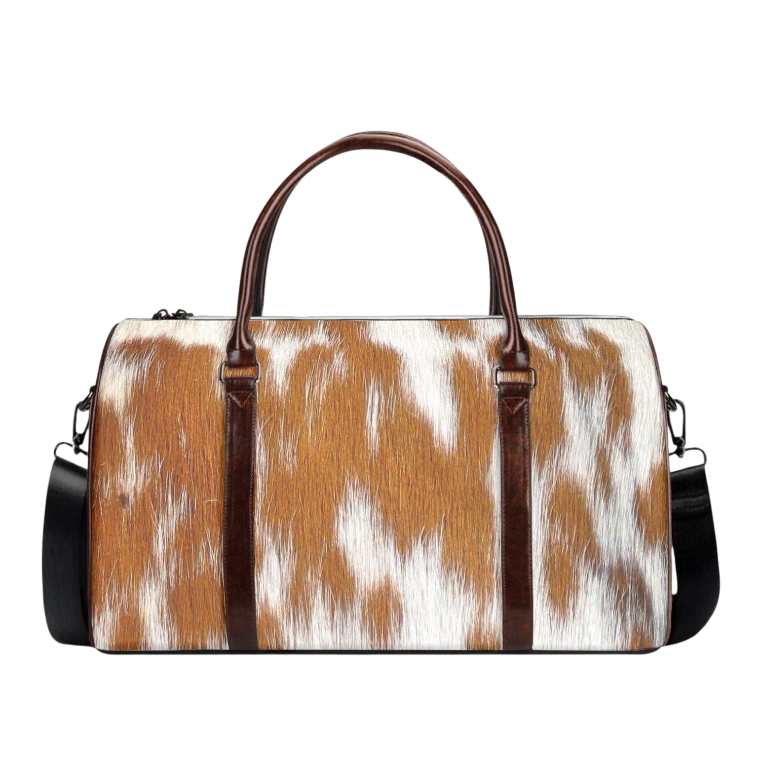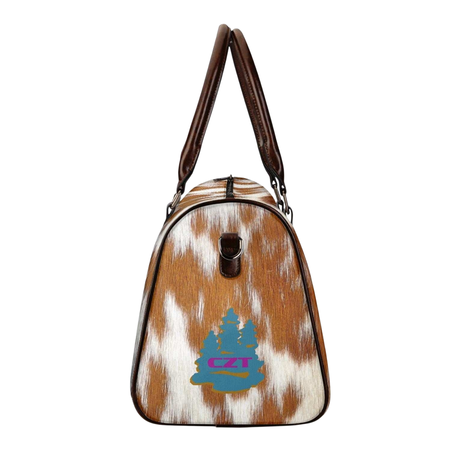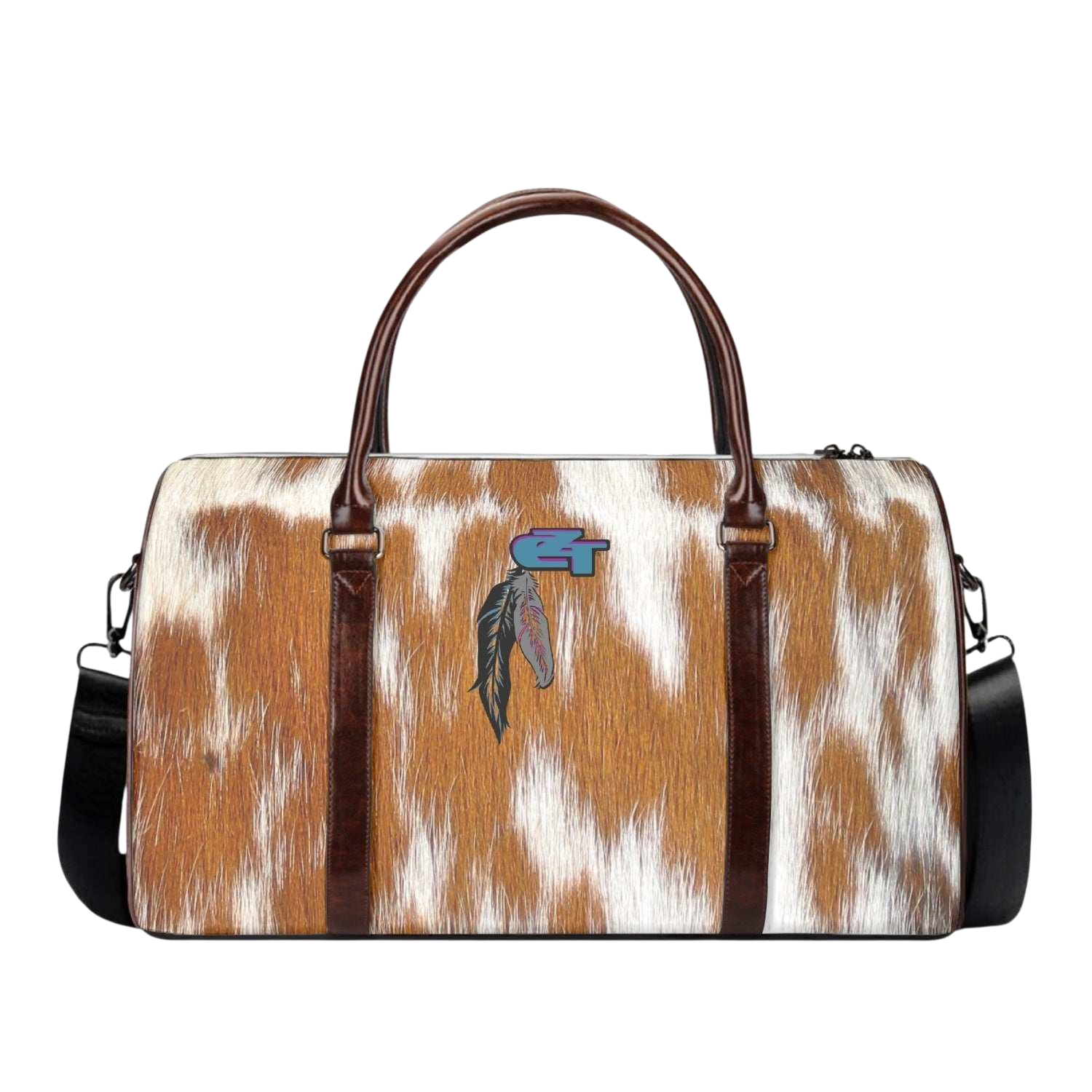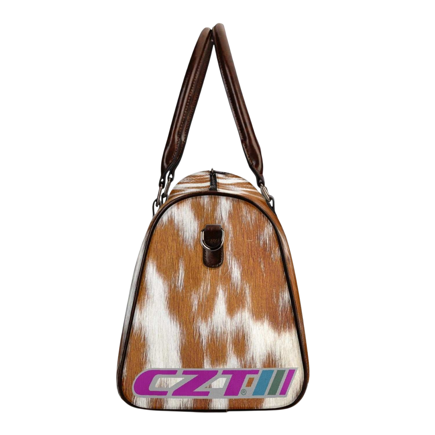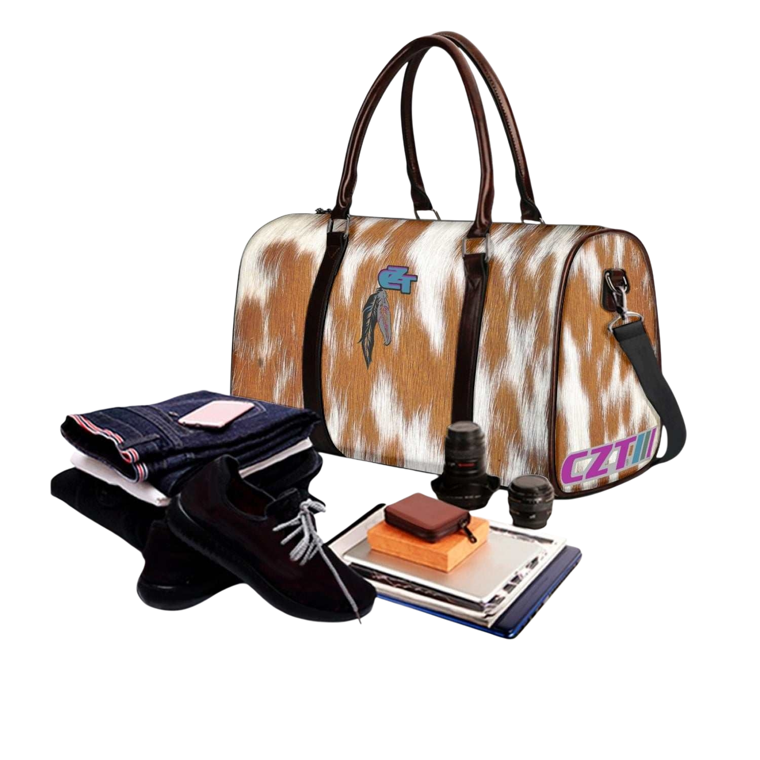 The CZT Moo-Hide Sustainable Travel Duffel Bag isn't just another carry-on—it's a bold declaration for those who travel with conviction. Crafted from battle-tested canvas adorned with an audacious cow-hide print, it merges grit with polish in a compact silhouette built for constant motion. Dual tote handles and a detachable shoulder strap adapt to your rhythm, while interior organization keeps your essentials locked down. Whether you're conquering city streets, boarding trains, or catching flights, this bag moves with you. Finished with signature Feather, Triple Stack, and Banner branding, it's unmistakably CZT—raw, refined, ready.
